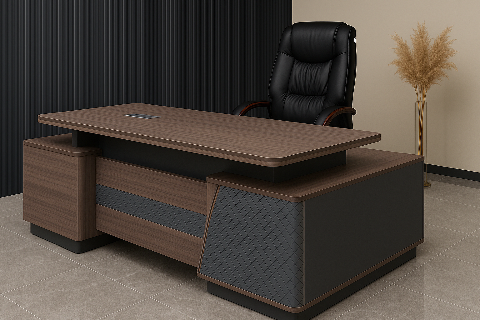 Redefine your workspace with this elegantly crafted executive L-shaped desk, now enhanced with built-in electric power features. Wrapped in a luxurious walnut finish and detailed with textured geometric accents, this desk combines sophistication, productivity, and tech-ready convenience—making it perfect for today’s modern executive or professional office.