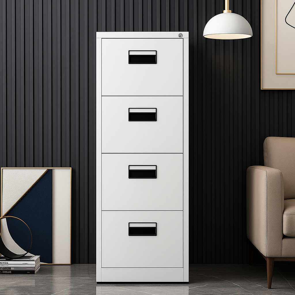 Organize your office with efficiency and elegance using this 4-drawer metal filing cabinet. Designed in a clean white finish, it offers a professional yet modern look that complements any workspace. With its vertical structure, this cabinet maximizes storage without taking up too much floor space, making it ideal for offices, institutions, or home workstations.