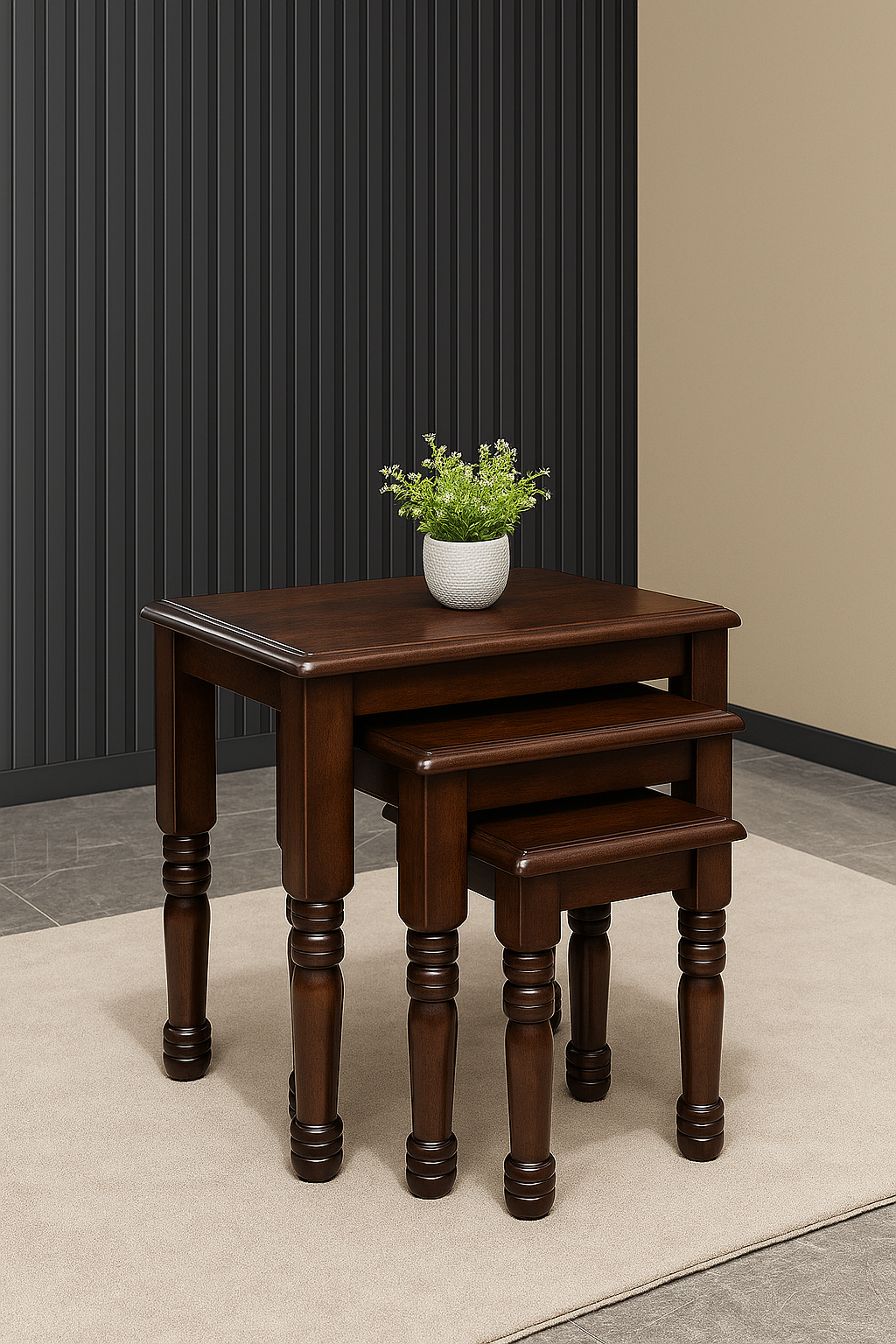 Bring timeless charm and functional style into your living space with this elegant set of classic wooden nesting tables. Designed with a rich dark wood finish and beautifully turned legs, these tables seamlessly blend into both traditional and transitional interiors. Whether used together or separately, they offer versatile surface space and compact storage, perfect for living rooms, bedrooms, or lounge areas.