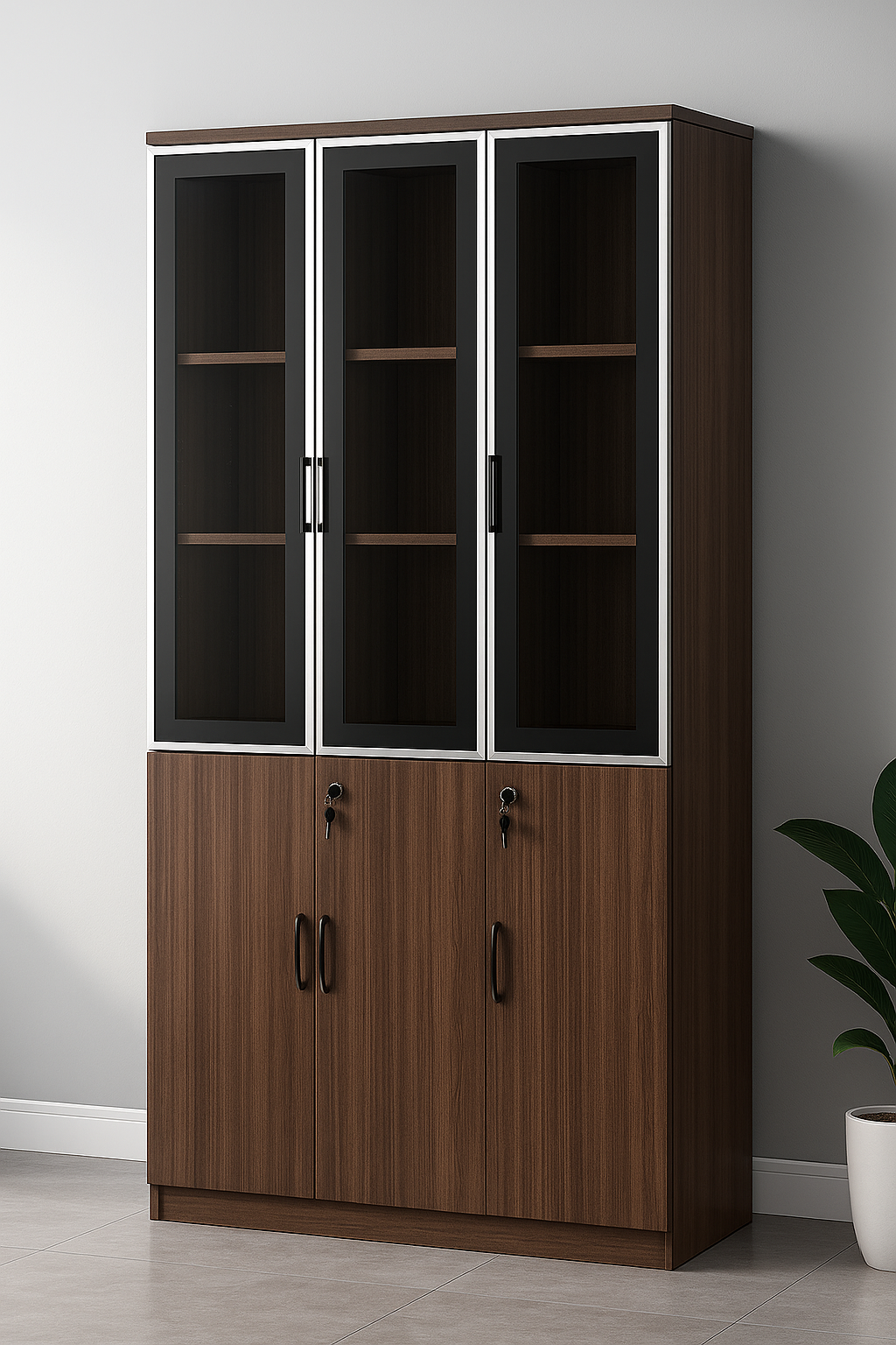 Refined and functional, the Executive Wooden Storage Cabinet is designed to elevate any modern office environment. With a rich walnut wood finish and sleek black-framed tempered glass doors, this cabinet strikes a perfect balance between sophistication and practicality. The upper section offers clear visibility for display or easy access to documents, while the lower lockable compartments ensure secure storage of confidential items.