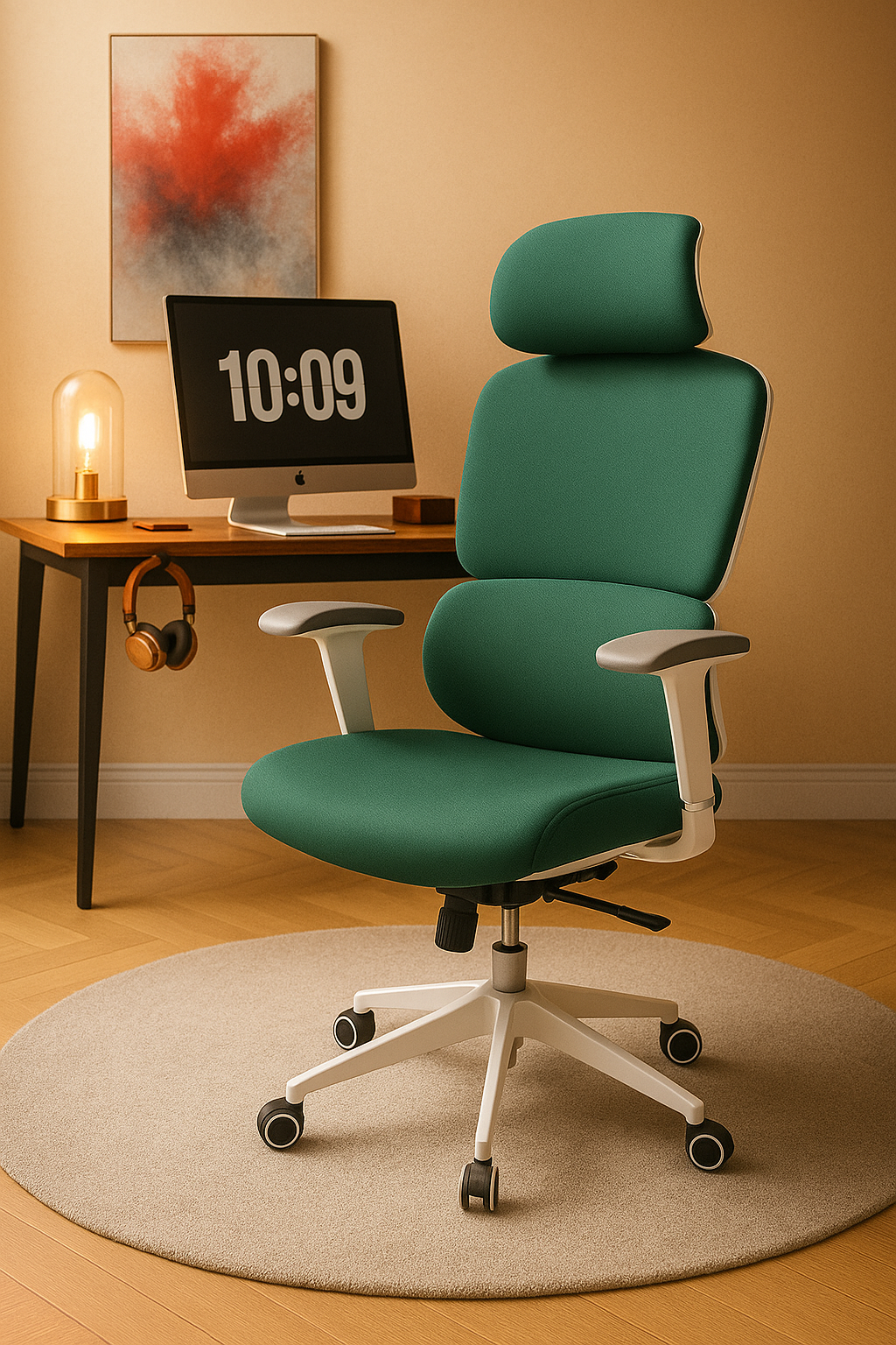 Refresh your workspace with this stylish ergonomic chair that combines vibrant design and superior comfort. Featuring an elegant green fabric finish complemented by a sleek white frame and soft grey armrests, this chair is designed to deliver all-day support for your home office or corporate environment.