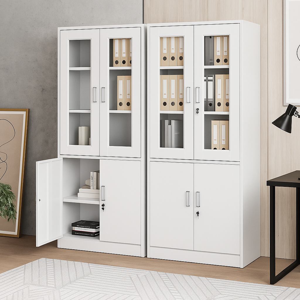 Upgrade your office organization with this sleek, dual-compartment filing cabinet set. Designed to blend seamlessly into modern workspaces, these cabinets offer a balance of visibility and security with their glass-paneled top doors and lockable lower compartments.