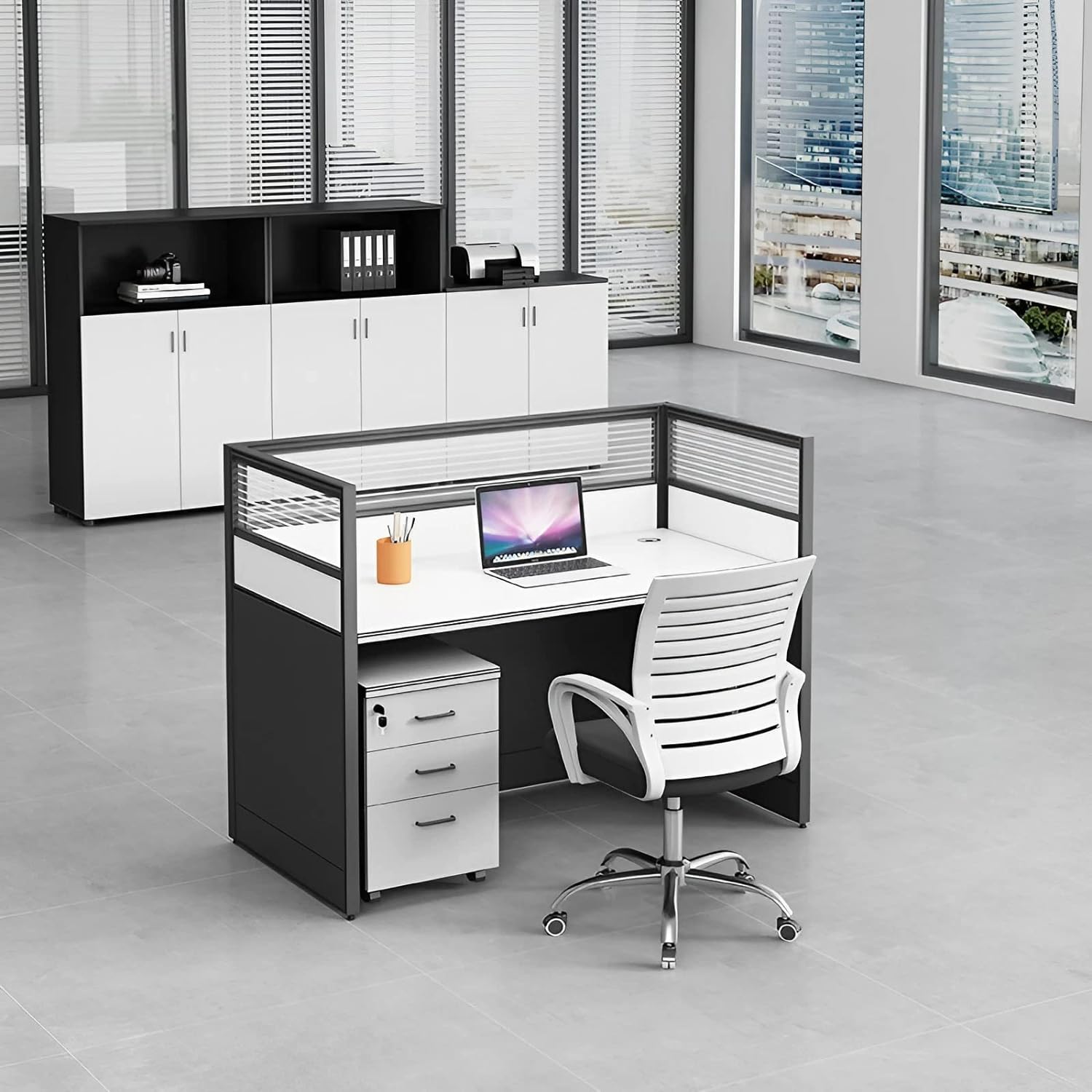 A combination of white, black, and frosted acrylic surfaces creates a clean, sophisticated look that complements contemporary office décor.